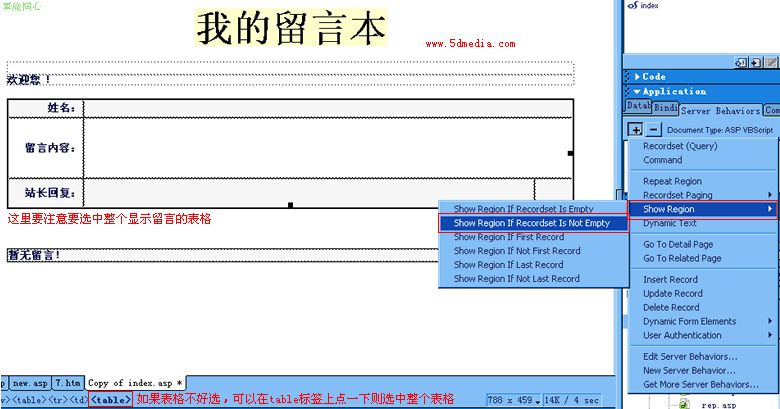 在前面我们提到,先要保证留言的正常显示就要做到在有留言的时候才显示留言,如果没有留言则显示“暂无留言”,那这些在DW MX里怎么做呢??在这里呢,我们要学习一个新的服务器行为show region(显示区域),即根据库里的资料来显示不同的资料。