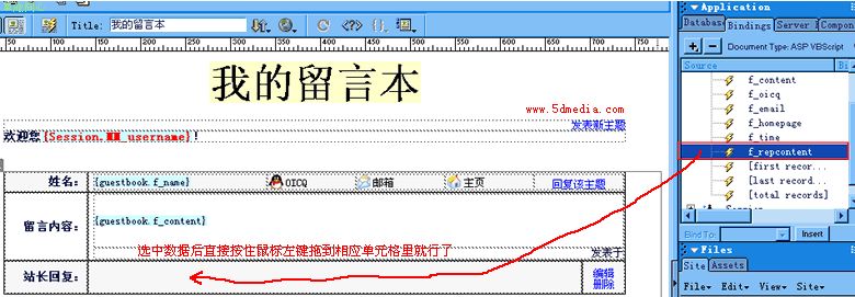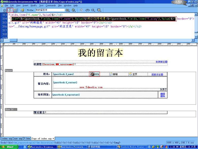 打开源码和设计视图,你会发现刚才插入的东东在代码里是alt="<%=(guestbook.fields.item("f_oicq").value)%>",COPY这段代码放到它的前面,并把其中的f_oicq改成f_name(数据库里发贴人的姓名字段),使它的最终代码为alt="<%=(guestbook.fields.item("f_name").value)%>的OICQ号码是<%=(guestbook.fields.item("f_oicq").value)%>",这样当它显示的时候便为“XX的OICQ号码是XX”,都动态绑定了,多好啊,呵。。