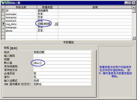 注册日期的时间类型改为 日期/时间,*_’ 当然嘛。然后我们可以调用access自己的函数功能为他添加一个默认值, =Now() ,这表示当数据添加时,数据库系统自动以服务器当前时间作为reg_date字段的值,这样我们就可以省去在网页中制作输入注册日期的一步了。