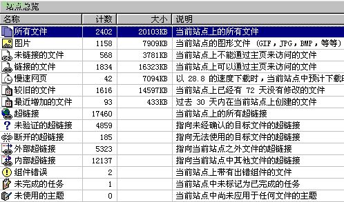 报表能够清晰的呈现网站的许多重要的相关信息,在“查看”菜单中,指向“报表”,从后面的选项列表中勾取“站点总览”,经过一段时间后,会进入站点情况的报告项目列表,如图: