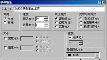 在弹出的一个“字幕属性”窗口中设置一下就行了(如图2)。我们在“文字”栏填上自己想要的文字,比如“欢迎你来到我的主页”。再设置一下其它选项,比如“方向”你选择了“左”的话,那么你做好的字幕就是从网页的左边开始向右边移动的。你还可以把其他设置成自己想要的,设置好之后按“确定”,回到编辑区你会看到有个方框包围着的字幕,点击“预览”按纽看一下,是不是很好可爱?