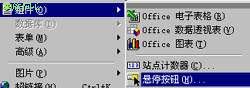 什么是动态按纽?你有没有看过别人的网页上有一种按纽,把鼠标移上去的时候它就会变色的的那种,那就是动态按纽了。它在Frontpage2000中的做法也很简单。我们点击菜单栏的“插入→组件→悬停按纽”(如图3)。接下来又弹出一个窗口(如图4)。