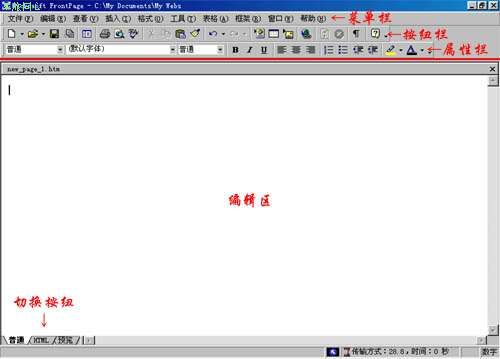 制作窗包括编辑区和切换按纽。我们就把编辑区当做是一张白纸吧,你可以在上面写字(用键盘打字)和画画(插入图片),具体操作我们将在下几章学习。编辑区左下角有三个按纽,我们把它们叫做切换按纽:点“普通”按纽,就会出现默认的编辑区。点“HTML”按纽,编辑区就会变成一个满是英文(?!)的窗口,我们可以在这里编辑HTML,但是对于初学者,笔者不建议你去乱动。做好了网页的时候,我们可以点一下“预览”按纽来观看自己做的网页,不满意可以再点“普通”按纽回到编辑区修改。