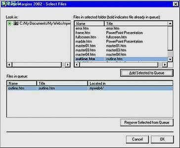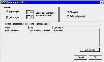 这个程序预设会将这两个设定值套用在目前网站里面的所有页面。不过在实际使用的时候,即使你选择了「仅套用在选择的页面(Selected Pages)」这个选项,你还是不会在「文件」区域里面看见目前网站的所有页面列表。如果你想把边界设定套用在网站中的某几个页面,你必须先打开该网站,然后选择前面提到的「仅套用在选择的页面」选项,然后按下「编辑队列(Edit Queue)」按钮。
