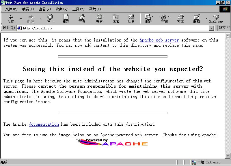 到此为止,Apache Server的配置基本上就完成了,可以检查一下配置的对不对。先运行Apache Server([开始]-)[程序]-)[Apache Web Server]-)[Start Apache])。运行成功后会弹出一个dos窗口(图3),如果弹出后马上就消失或者dos窗口内容不是图3,那么很有可能是你的第5条(ServerName)没设置对。运行成功后,在IE浏览器的地址栏中输入http://localhost/,如果没错应该出现图4画面。这就代表你已成功的配置了Apache服务器。