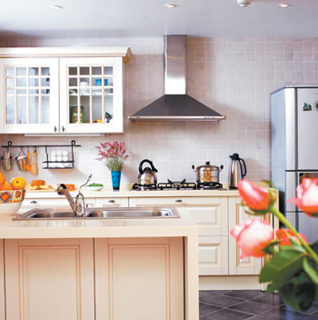 厨房色彩杂乱无章,会使烹调者东张西望的眼睛得不到放松,易产生疲倦感。因此,厨房的设计要简约干净顺畅。清新明快的厨房空间,消除杂乱色彩和线条是厨房设计的方向。厨房的主色调应讲究柔和,添补色不应与主色调形成反差。目前市场上橱柜门板、台面和把手的设计多以直线条为主。