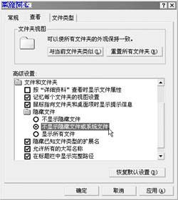 很多人都使用这样一种简单的办法来保护和隐藏自己的重要文件:在“高级设置”窗口中,选定“隐藏文件”中的“不显示隐藏的文件或系统文件”(如图1),然后在资源管理器中将重要文件或文件夹的属性设为“系统或隐藏文件”,从而令文件从他人的眼皮底下消失了。