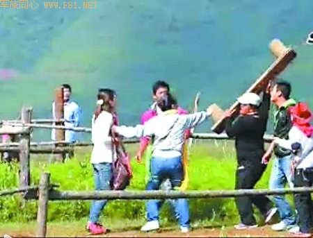 这时,一戴白帽的妇女过来抡起一个凳子向白衣女子砸去,但没砸中。黑衣男子继续对白衣女子拳脚相加,白衣女子被甩翻在地。这时,八九个人过来劝架将双方拉开。不料,一黄衣女子又赶来用手中的马鞭抽打白衣女子,另一红衣妇女也对白衣女子拳脚相加。跟随白衣女子的一名约10岁的小女孩吓得大哭。