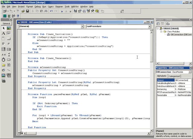 到目前为止,我们已经成功的将DBConnection 类的代码转移到了Visual Basic里面.对大部分地方来说,这个代码是完整的.除了类的构造函数中对ASP Application对象的引用和Server.CreateObject那一行以外,这个代码就可以编译了.为了保证一个编译良好的对象,一点点代码上的修改是必要的.