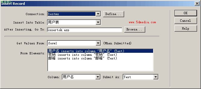 After Inserting, Go To:这充许在完成插入后把用户重定向到另一个页面,即数据成功保存进数据库后显示给用户看的页面,告诉用户数据已插入进数据库里。在这里我们定义为insertok.asp。注:不要忘了建立这个页面呀,如果找不到页面就会报错哦!