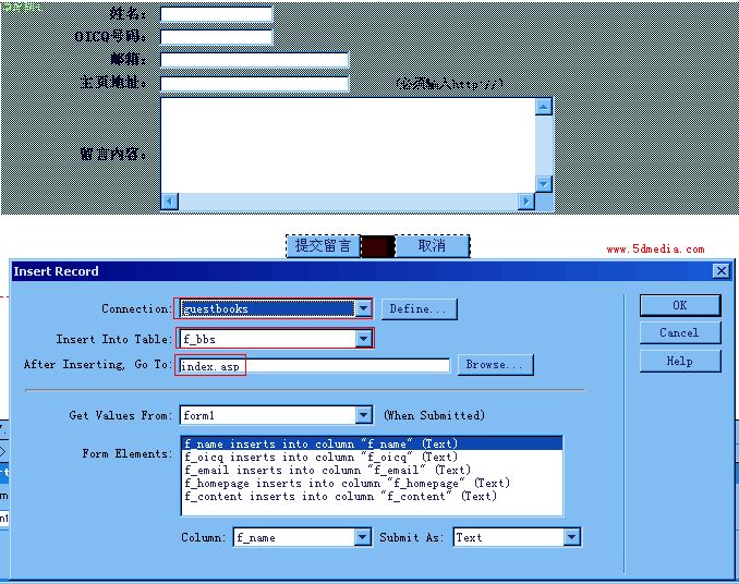 记得要为f_name和f_content划上那个必填字段的勾,f_oicq的可接受类型改为Number,f_email的可接受类型改为Email Address。