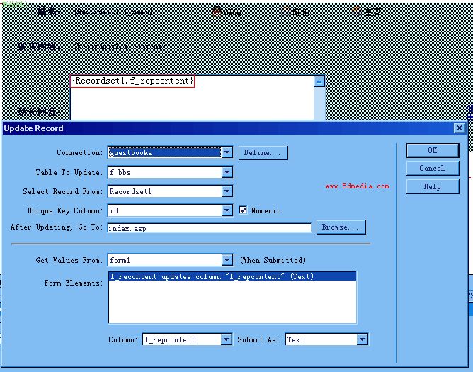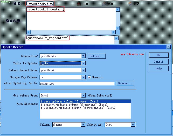这里是edit.asp页,建立记录集的时候和前面相同,不过要记得应用Move To Specific Record服务器行为,这样才能找到对应的记录集。还有上面表格制作的问题和index.asp的一样,只不过要把显示的用户名,用户留言和站长回复改成文本框,并把相应数据库字段拖到文本框里,最后应用Updata Recordt服务器行为,再定义更新数据后返回到index.asp页面就行了。这里还有一点要注意,要把整个大表格放到表单里才有效。