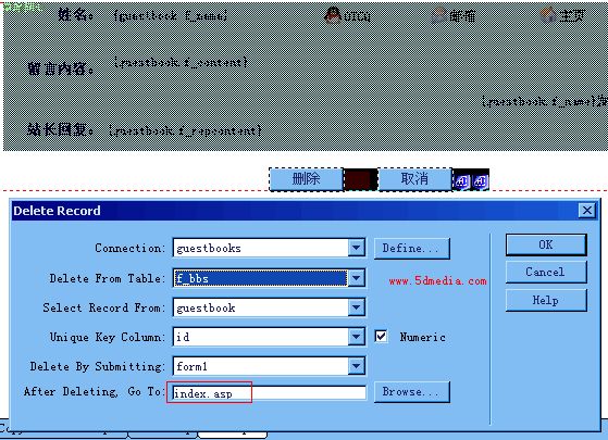 这个是del.asp页,同样要建立表单哦,不过不用把姓名等改成文本框了,因为只是删除数据,重要的还有Move To Specific Record服务器行和Delete Record服务器行为,最后定义删除后转到index.asp页面。