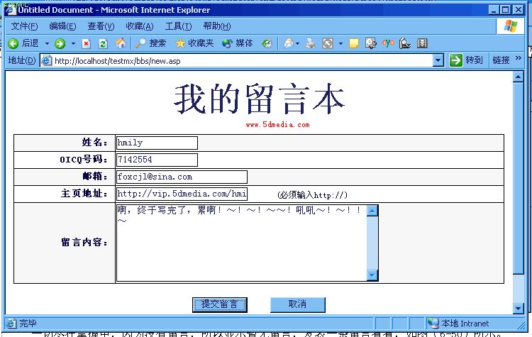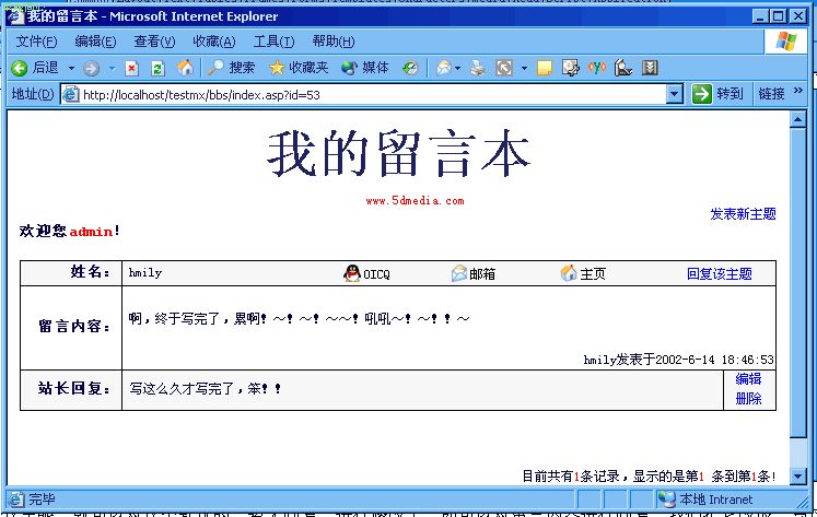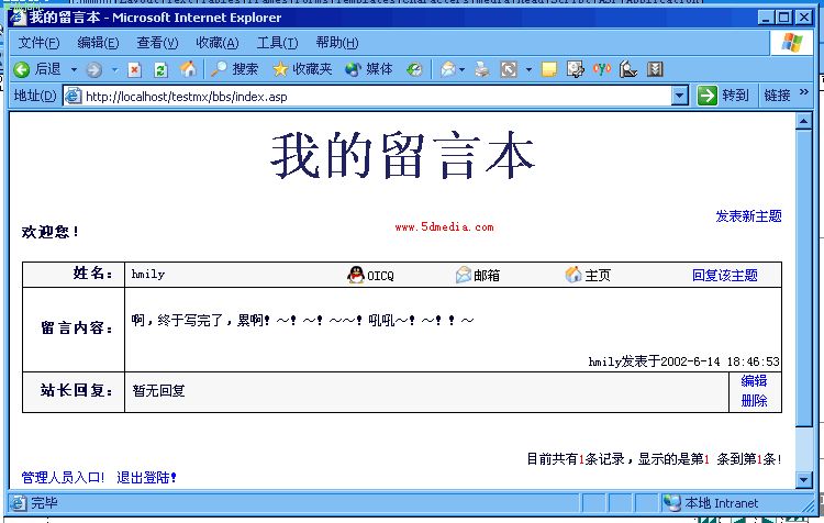 至于其它功能如编辑,导行条等等在这里也不一一测试了,这个小小的留言本当然还不是在完美,但我在这里只提供一种思路,希望大家能更好的改进它,同时我也对这个小留言本提供下载,由于建立的是DSN连接,下载回去后请自行建系统DSN连接,名字为textmx。