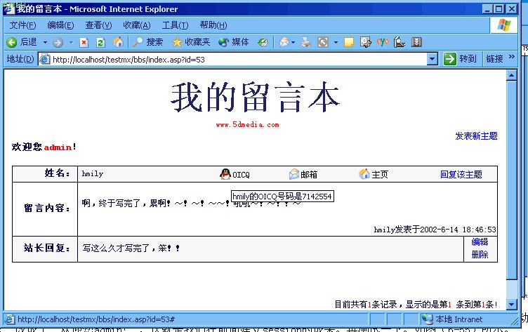 当鼠标在OICQ头像上停一下的时候则会出现“hmily的oicq号码是7142554”,这些也是我们前面辛勤劳动的成果,其它如邮箱和主页等在这里也不一一测试了。
