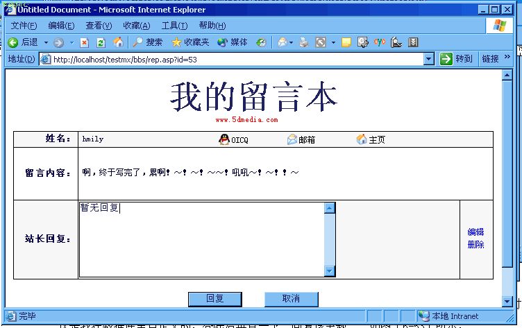 啊,显示出来也耶!!!!好高兴哦,由于还没有回复,所以显示的暂无回复。好,再试试回得留言,如图(7-52)所示。