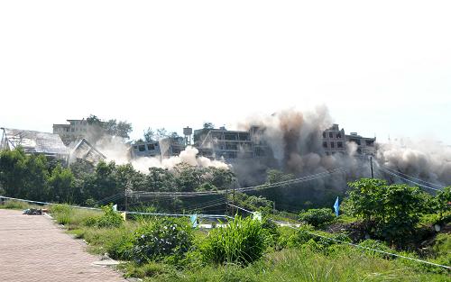 东方网8月6日消息:8月5日,海南省海口市政府组织多部门联合对位于丁村城南路东侧的13栋近2万平方米违章建筑实施定向爆破拆除,这是海口市首次对违章建筑实施爆破。