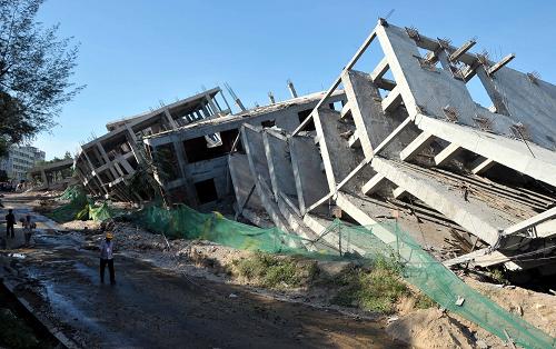 8月5日,经过爆破拆除后的违法建筑连片倒塌。