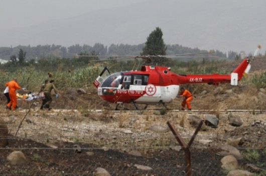 8月3日,在以色列北部边境,一名以色列受伤士兵被救援人员从直升机上抬下。 新华社发