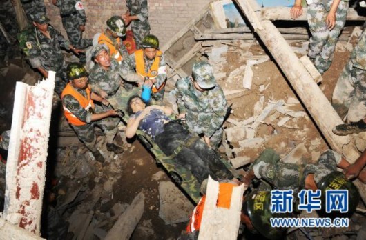 8月8日20时50分左右,兰州军区某防化团官兵救出一名幸存者。甘肃舟曲县特大山洪泥石流灾害发生后,兰州军区某防化团602名官兵经过6个多小时的急行军到达灾区,随即展开人员搜救,截至8日20时50分共救出9名幸存者。目前,官兵们仍连夜奋战在救援一线,争分夺秒进行生命大营救。新华社发 (张永进 摄)