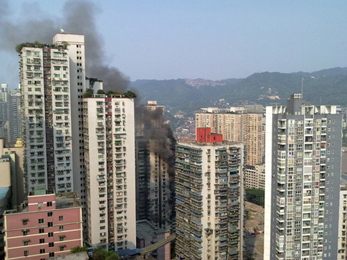 东方网8月9日消息:今日16:27分左右,重庆渝中区文化街一居民楼第8层发生火灾,由于起火点位于房间阳台,火势沿着雨棚迅速蔓延。