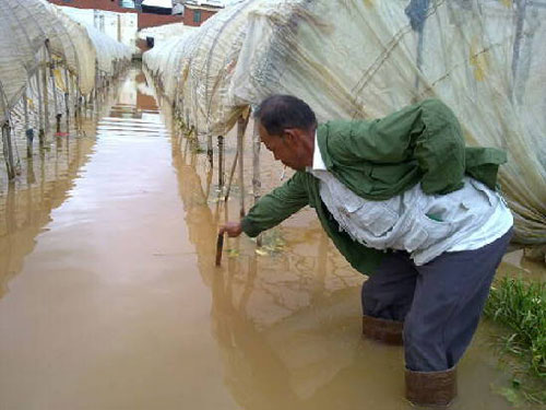 当地农民在试农田水深,积水达六十公分以上 肖军昆 普萱 李旭俊 代良燕摄