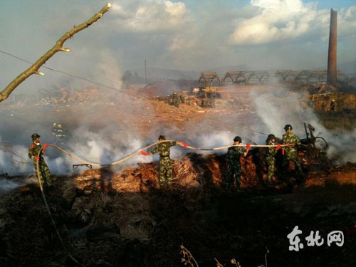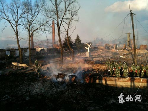 东方网8月16日消息:记者17时10分许自鸡西方向进入伊春市区,自入城口至事发现场一路已经戒严,事发现场位于河边,消防队员正在从河里取水扑火救援,目前仍有明火烟雾非常大,从很远处也可望见,地上有一层厚厚烟花碎屑。