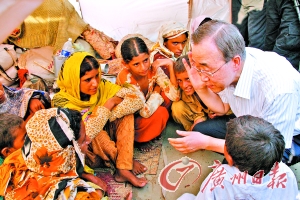 15日, 联合国秘书长潘基文慰问一些受灾的儿童。