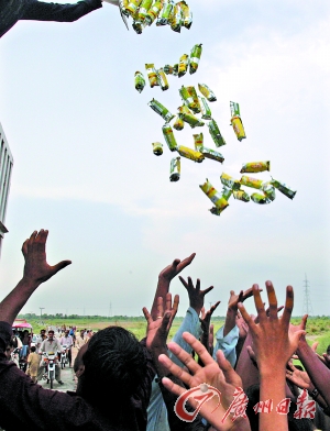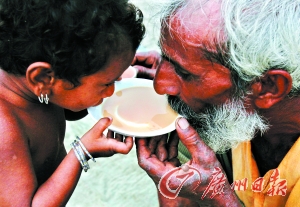 16日,灾区一名老人和一个小男孩在分享一碗奶茶。