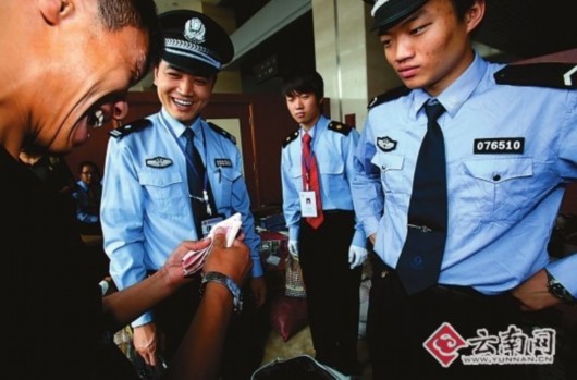 “这是我的箱子,里面有我的大学录取通知书。”来自西安的王心皓有些兴奋,按工作人员的要求,他先认出自己的箱子,说出一两样箱子里的东西,然后打开箱子让工作人员核实。此刻,王心皓拉拉链的手都有点抖了,好不容易拉开行李包一看,正是大红色的昆明理工大学录取通知书,于是兴奋地喊道:“爸爸,找到啦,在这里。”