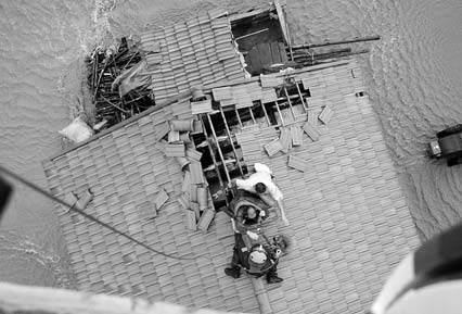 经过近两个小时的飞行,B~7312救助直升机到达丹东机场中转加油。此时传来的消息是:洪水已经涨至齐腰深,4名群众被困“孤岛”。由于当地天气突然变坏,潘伟队长、副驾驶李春雨数次尝试绕开雷雨区,均未成功。直升机随即返航。