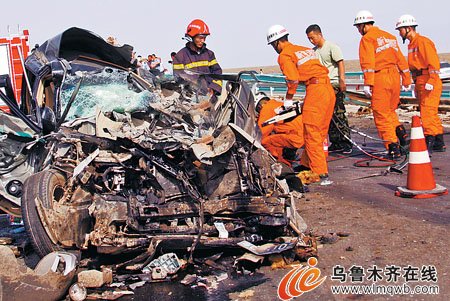 昨日,记者从托克逊县有关部门获悉,发生碰撞事故的是一辆油罐车、一辆拉载水泥的挂车及两辆轿车。初步判断事故原因为水泥车刹车失灵后撞上前三辆车。
