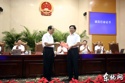 黑龙江省委书记、省人大常委会主任吉炳轩(左)向王宪魁颁发任命证书。