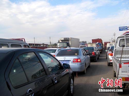 记者下午5时到达现场时,已经有多名交警在现场疏导交通,但车流仍通行缓慢。很多附近村民,提来矿泉水向堵在该路段的司机、乘客兜售,生意着实不错。