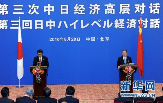 8月28日,国务院副总理王岐山在北京人民大会堂与日本外务大臣冈田克也共同主持第三次中日经济高层对话后,共同与记者见面。 新华社记者张铎 摄