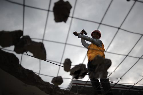2010年8月29日,工人古师傅在贵阳彭家湾破拆预制板。新华社记者 刘续 摄