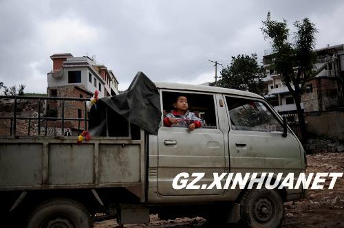 2010年8月29日,贵阳彭家湾的一片废墟前,一名孩子从车里探出头来张望。新华社记者 刘续 摄