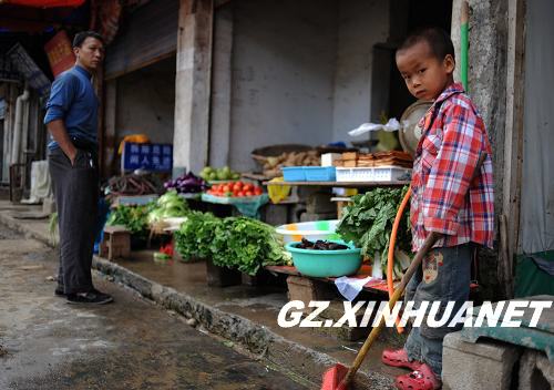 2010年8月29日,小凯凯(右)在自家位于彭家湾的菜摊前。原本热闹的街上,现在只剩他们一家在做卖菜生意了。新华社记者 刘续 摄