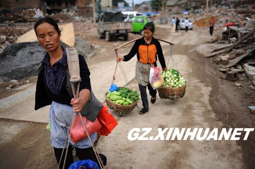 2010年8月29日,两名妇女挑着蔬菜到彭家湾售卖。新华社记者 刘续 摄