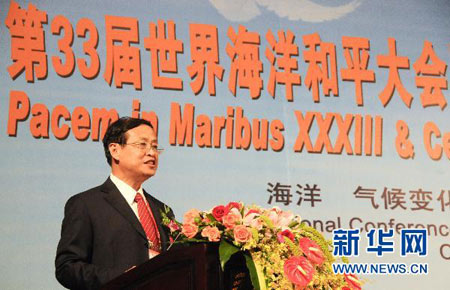 9月3日,中国国家海洋局局长、本次大会联合主席孙志辉在开幕式上致词。当日,第33届世界海洋和平大会暨联合国教科文组织政府间海洋学委员会成立50周年庆典在北京开幕。新华社记者王建华摄
