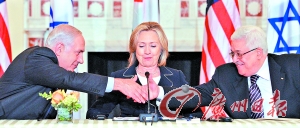 在希拉里的关注下,内塔尼亚胡(左)与阿巴斯(右)亲切握手。