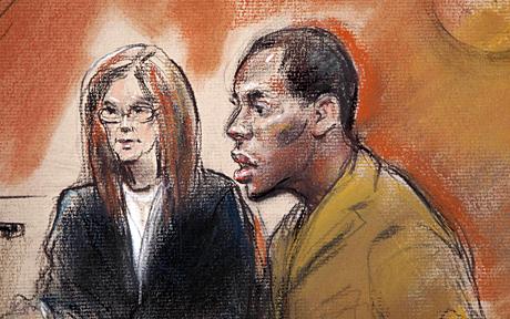素描:穆塔拉布(右)在底特律法院接受审判,左侧为法庭为其指定的律师。