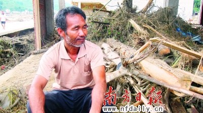 李新章每天都来看被冲毁的新家,蹲在房屋“残骸”中发愁。徐滔摄