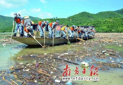 东方网9月27日消息:受洪水和泥石流灾害影响,大量树木、房屋残骸、生活垃圾等杂物被冲进高州大型水库,在库区形成约4公里长、300米宽的漂浮物带。南海舰队某陆战旅紧急行动,迅速组织打捞突击队,100多名陆战队员昼夜奋战在库区第一线。据救灾前线指挥员张文胜副旅长介绍,该旅救灾部队到达后,已疏通道路1000多米,清理水面漂浮物数十吨。