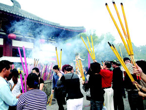 游客在“烧高香”(资料图片/图片来源:中国旅游报)
