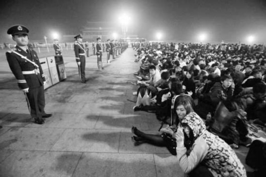 今天凌晨3时许,大批观看升旗的群众聚集在天安门广场,武警在现场维持秩序。 摄/记者王丹