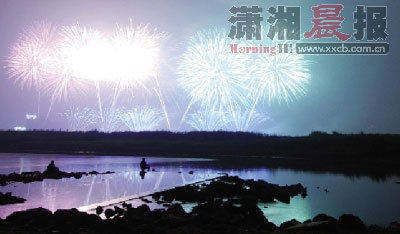 10月1日晚8点,绚烂焰火如期在橘子洲上空绽放,江边的垂钓者依然保持着钓鱼状态,看焰火和钓鱼两不误。图/记者沈荣华