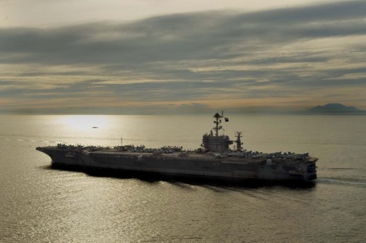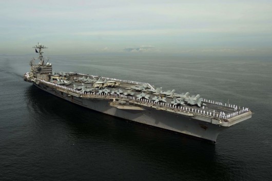 “乔治·华盛顿”号1992年开始服役,排水量9.7万吨,航速可超过30节,其飞行甲板长约330米,高约75米。船舱有3300多个房间,最多可容纳6250人。“乔治·华盛顿”号拥有两个核反应堆,一次加注燃料可行驶20年。