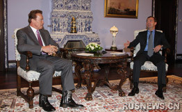 俄罗斯总统梅德韦杰夫会见美国加州州长施瓦辛格。(左)