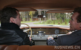 在短时间的交谈之后,梅德韦杰夫和施瓦辛格坐上浅奶油色“海鸥”牌轿车,由梅德韦杰夫亲自驾车,一起前往斯科尔科沃。